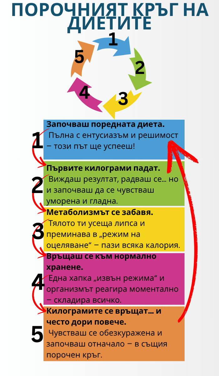 Когато започнеш диета и ограничиш храната, тялото ти не разбира, че искаш да отслабнеш – то мисли, че си в опасност. Затова започва да пести енергия, забавя метаболизма и се опитва да задържи мазнините, за да оцелееш.